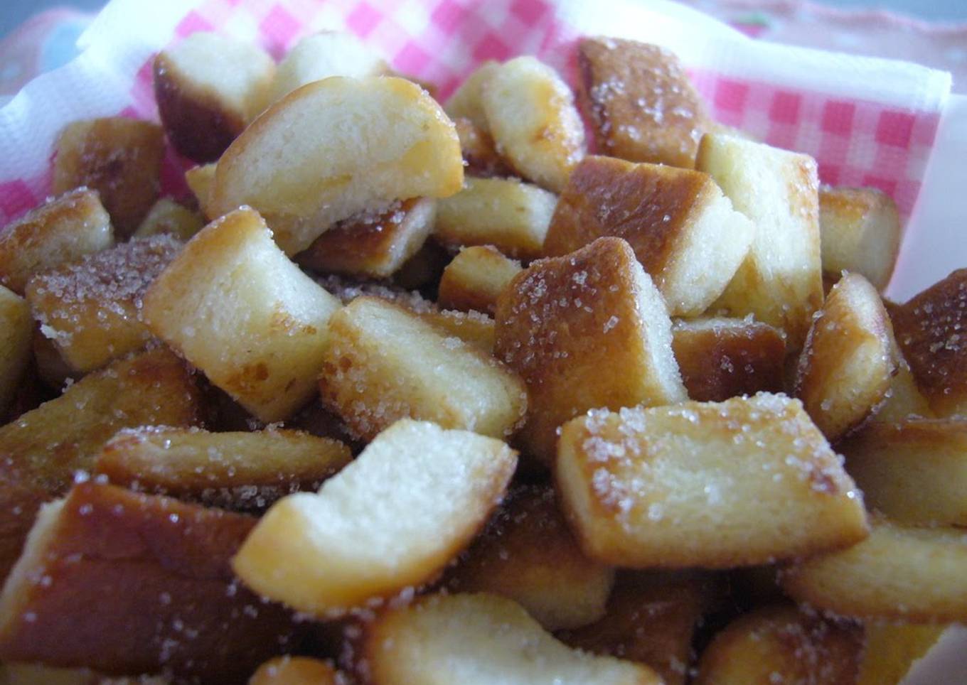 - When all the margarine has been absorbed by the bread crusts, add the granulated sugar. Roast until the bread crusts are crisp and all the moisture has evaporated.