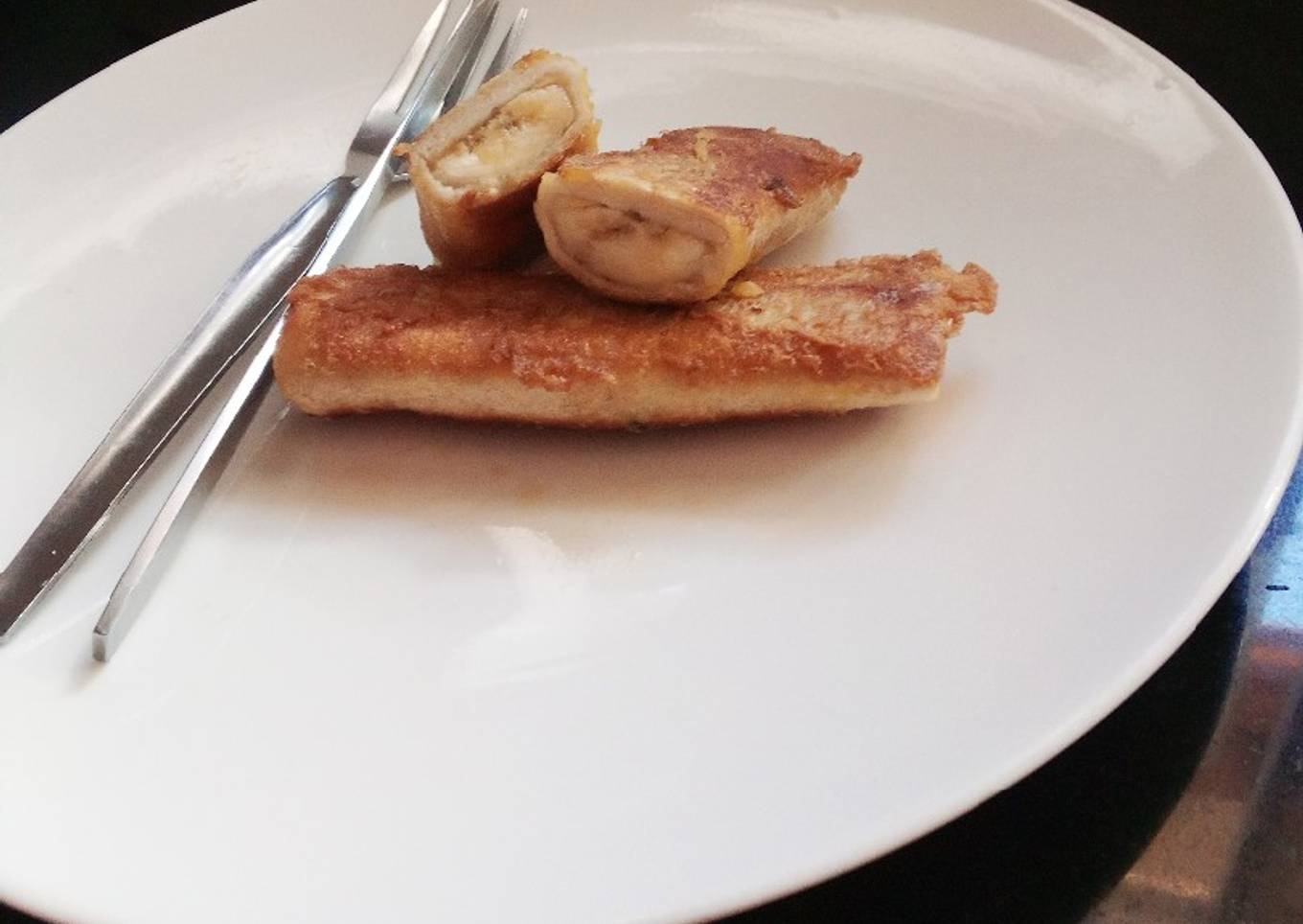 - Heat up your pan and melt the butter.Coat the banana stuffed bread in eggs and fry until golden brown.