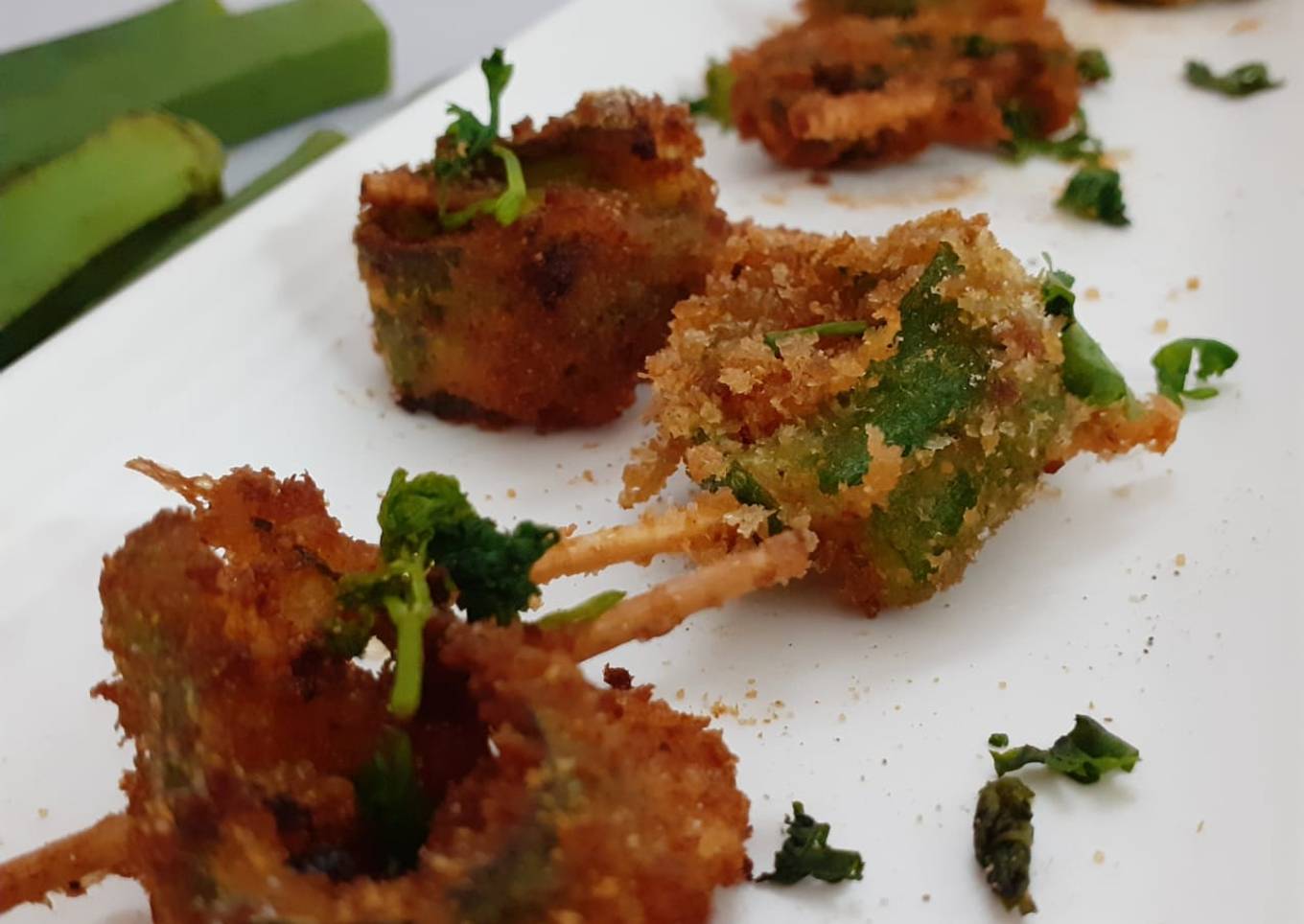 - Make a round with ladyfinger and stick them with toothpick...make all rings like this. dip them in the slurry and then coat it with breadcrumbs.