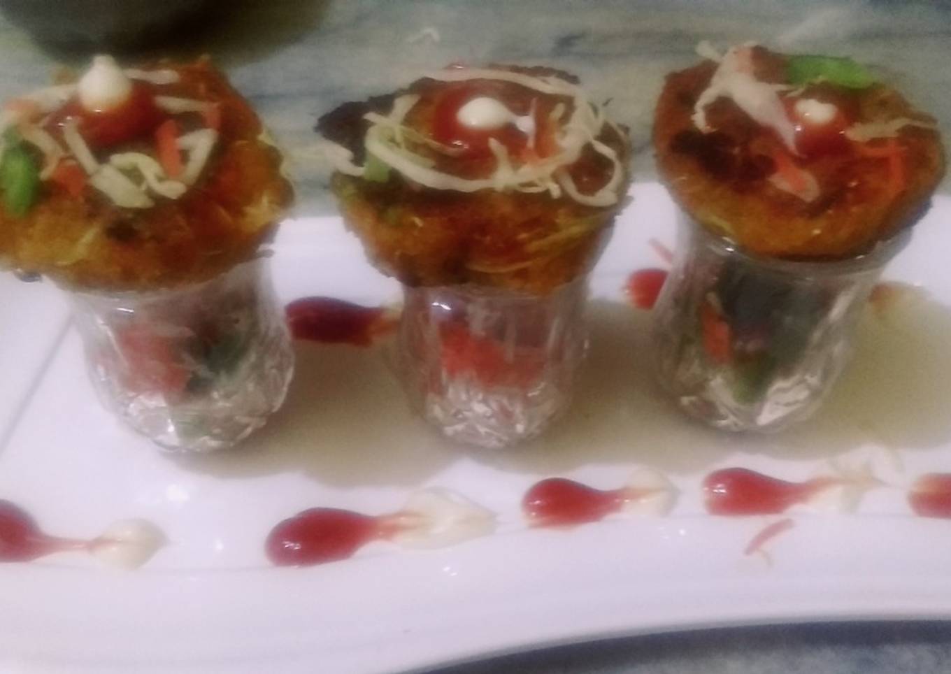 - Put in shots glasses chopped salad and places tikkis at the top of it and enjoy.