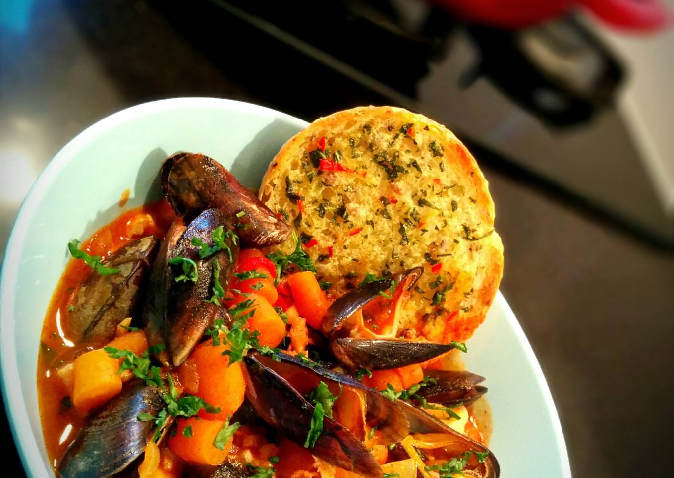 - Ladle a few loads of the Seafood mixture in a deep plate, add the grilled half rolls to the side, let it soak a little and sprinkle with parsley.
