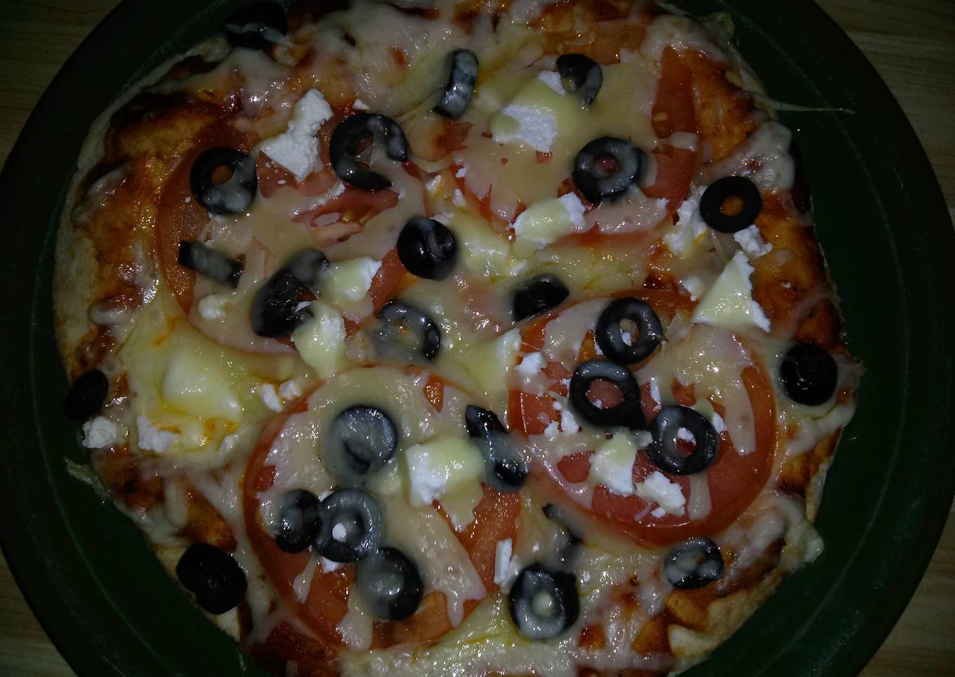 - Add some sauce to your pita and spread it around then add a little of the shredded cheese then sliced tomato feta cheese then olives then add more cheese on top ...bake for 8-10 minutes depending on your oven just keep an eye on it make sure it don't get to crispy